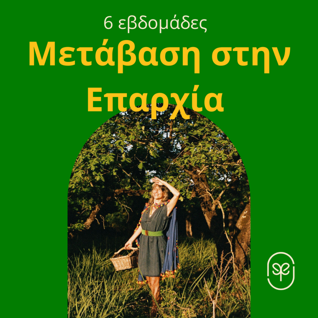 Πάρε μέρος σε ένα συναρπαστικό ταξίδι 6 εβδομάδων για να ανακαλύψεις αν η επαρχία είναι πραγματικά αυτό που σου ταιριάζει – είτε σκέφτεσαι να κάνεις τη μετάβαση, είτε μένεις ήδη στην επαρχία. Μαζί θα ανακαλύψουμε τι σε εμπνέει, τι να προετοιμάσεις και πώς να αρχίσεις να σχεδιάζεις έναν αναζωογονητικό τρόπο ζωής που θα σε συνδέσει με την αυθεντία σου, τη δημιουργικότητά σου, την κοινότητά σου και τη Φύση.